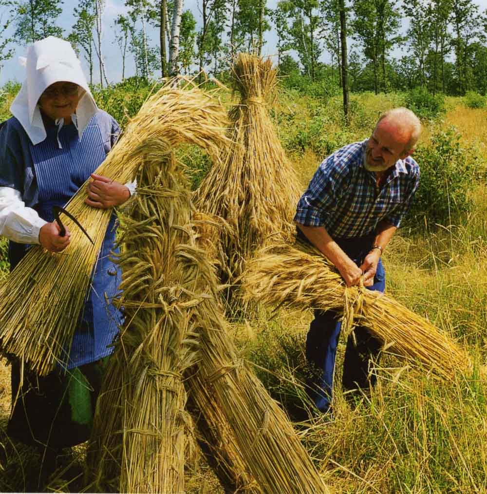 Das Roggenstroh wurde damals mit der Sichel bzw. mit der Sense abgeschnitten, denn die Halme durften nicht geknickt werden und mussten gerade bleiben. Das Stroh wurde mit den Ähren, nachdem es im Hauberg oder auf dem Felde getrocknet war, von Hand über eine Holzbank oder ein großes Fass geschlagen um die Körner so weit wie möglich zu entfernen. Danach wurde es durch einen hölzernen Schabrechen gezogen wobei Krummstroh und Fremdpflanzen entfernt wurden.